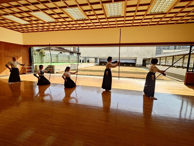 本日の矢渡し、射手・後藤先生、第一介添は田中さん、第二介添は井上さんです。介添え2名は経験を積むため積極的に志願して挑みます。